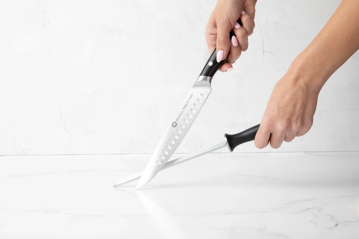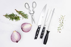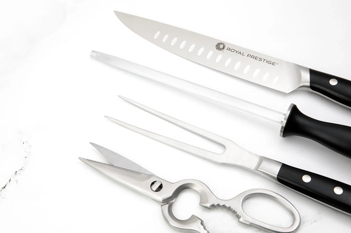 O Royal Prestige® Carving Knife Set inclui as facas que todo amante de carne deseja. O conjunto completo é ideal para aquele churrasco com a família e os amigos. Tenha tudo o que precisa à sua disposição para agradar a todos com um corte imbatível, com facas que possuem um cabo que permite uma pegada mais confortável e profissional, um excelente fio e acessórios que serão seus aliados, como o Royal Prestige® Sharpening Steel e a Royal Prestige® Kitchen Shears que facilitará suas tarefa.