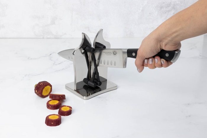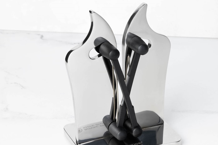 De diseño innovador y elegante, el Royal Prestige® Knife Sharpener te ayuda a mantener tus cuchillos listos para usar, permitiéndote afilar, alinear y pulir todo tipo de cuchillos, ya sean de hojas lisas o serradas. Su sistema de mariposa se ajusta automáticamente para adaptarse a los ángulos de la hoja.